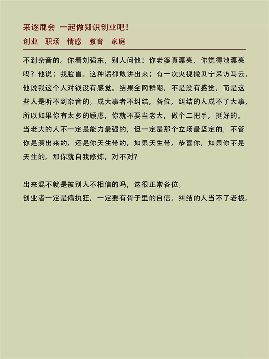 真正强大的人根本不会被外界的影响,一个真正目标感很强的人,是听不进、听不到杂音的。你看看马云,有一次央视的主持人撒贝宁访问马云,他说我这个人对钱没感觉,结果全网群嘲,不是没有感觉,而是这些人是听不到杂音的。