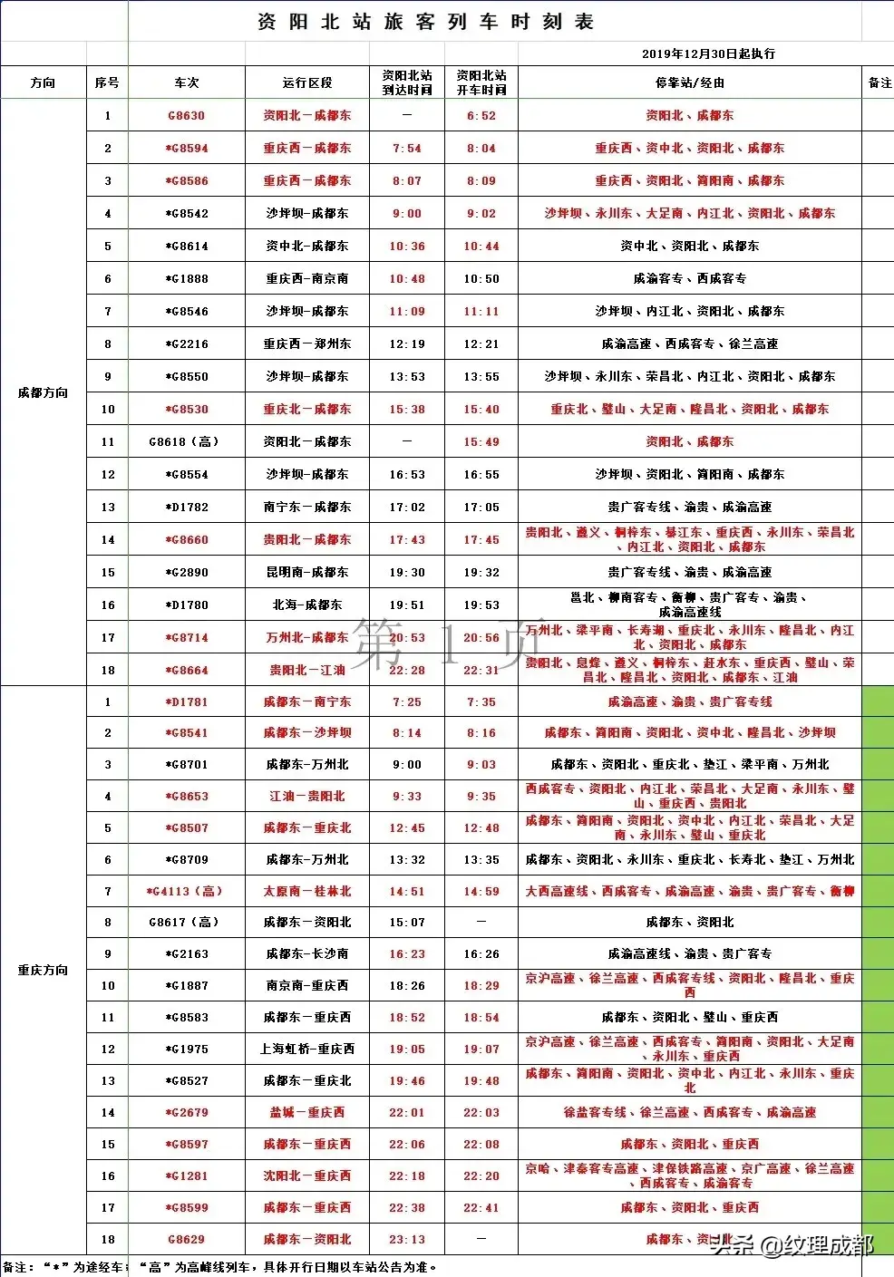 成渝高铁时刻表12月30日起调整,途径及到达资阳列车增加17列。