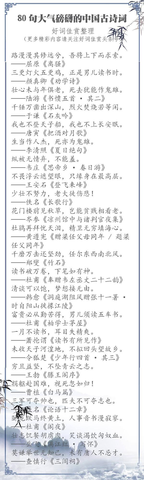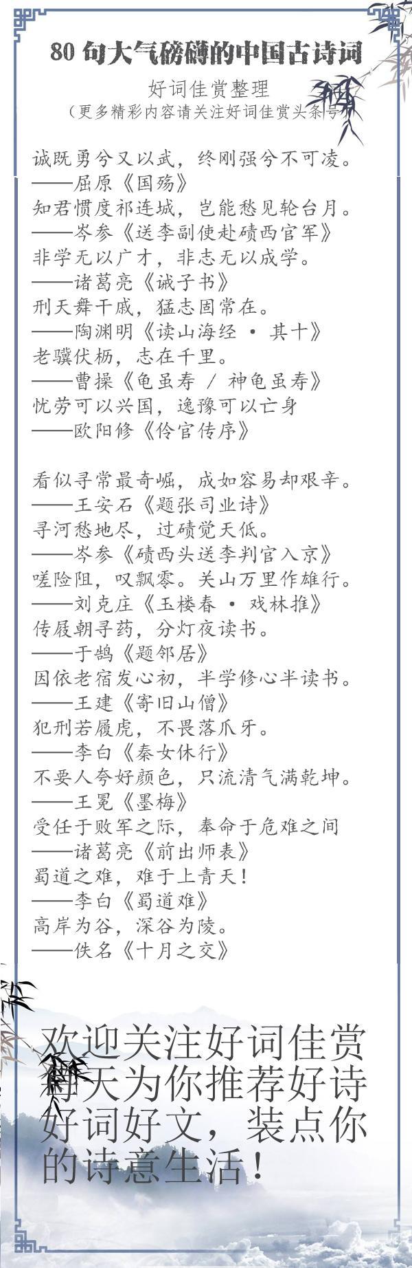 好词佳赏为大家整理了80多句大气磅礴的古诗词名句,在此分享给大家,希望大家能够喜欢。