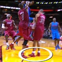在上面图片中,防守球员由于脚踩在弧线,和进攻球员发生了身体接触,这样的话,就要被判罚阻挡犯规了。