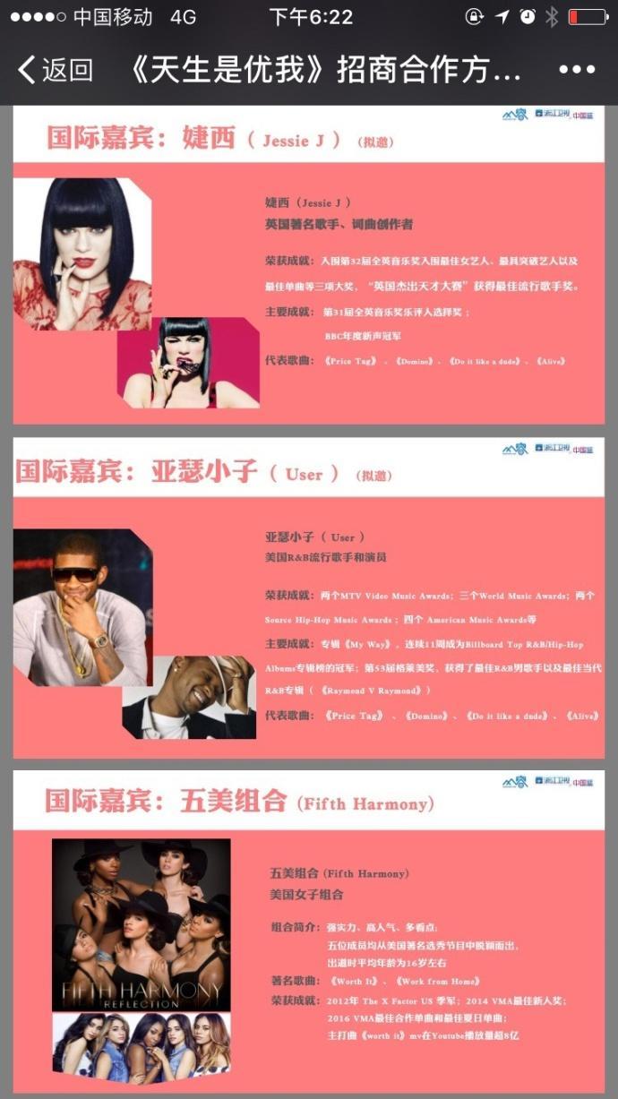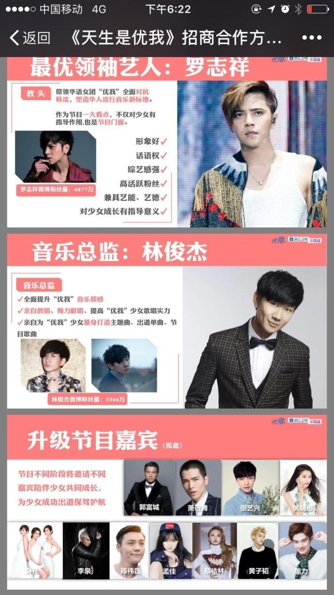 浙江卫视《天生是优我》3月周六22点档,叠播《高能少年团》,节目分三个阶段:预赛3集+资格赛6集+冲刺赛3集,最优领袖艺人罗志祥,音乐总监林俊杰,拟邀嘉宾:郭富城、萧敬腾、张艺兴、关晓彤、SHE、李泉、陈伟霆、孟佳、蔡依林、黄子韬、董力;以及国际嘉宾:婕西(jessie.j)、亚瑟小子(User)、五美组合(FifthHarmony)、白银组合(Serbro)、莫拉.戈多伊舞蹈团。作为2017年全国唯一的一档女团节目,升级准艺人组成女团与国际女团PK的励志养成真人秀,节目还是很有看点的。