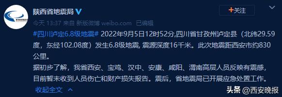 2022年9月5日12时52分,四川省甘孜州泸定县发生6.8级地震,陕西省地震局今天下午发布消息:陕西省西安、宝鸡、汉中、安康、咸阳、渭南高楼层人员反映有震感,目前暂未收到人员伤亡和财产损失报告。