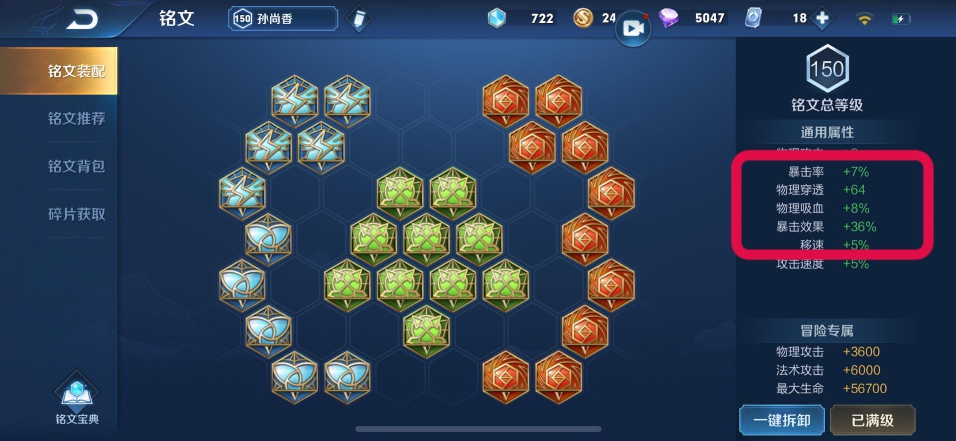 我们可以从技能分析里面很容易就知道孙尚香是一个靠技能打伤害的英雄,所以我们可以配合技能搭配一套铭文。