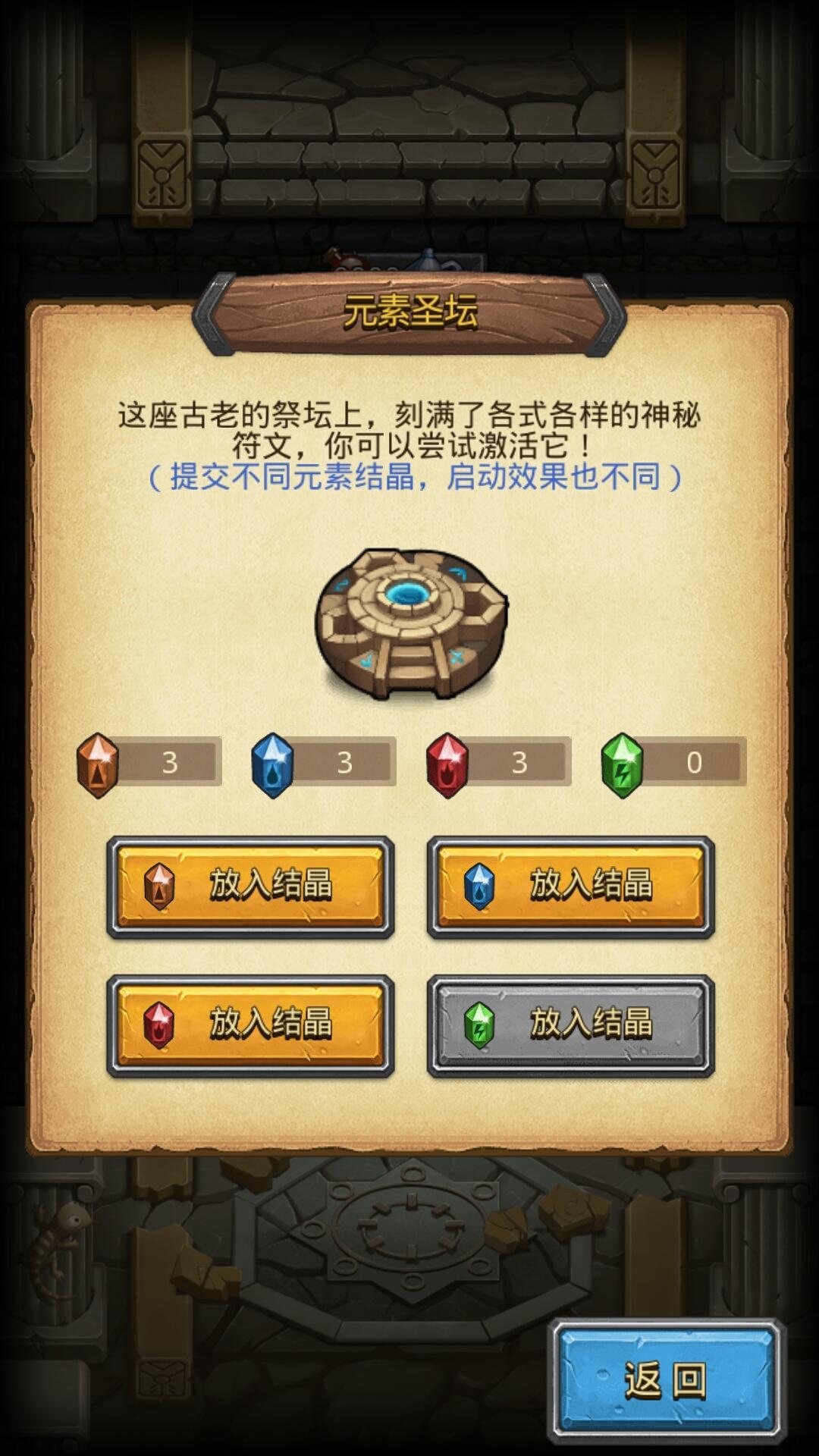 8.点击元素圣坛,先提交【土元素结晶】(黄)、【水元素结晶】(蓝)、【水元素结晶】(蓝)(激发消除特性效果),再提交【火元素结晶】(红)、【火元素结晶】(红)、【水元素结晶】(蓝)(施放内爆术),打死boss