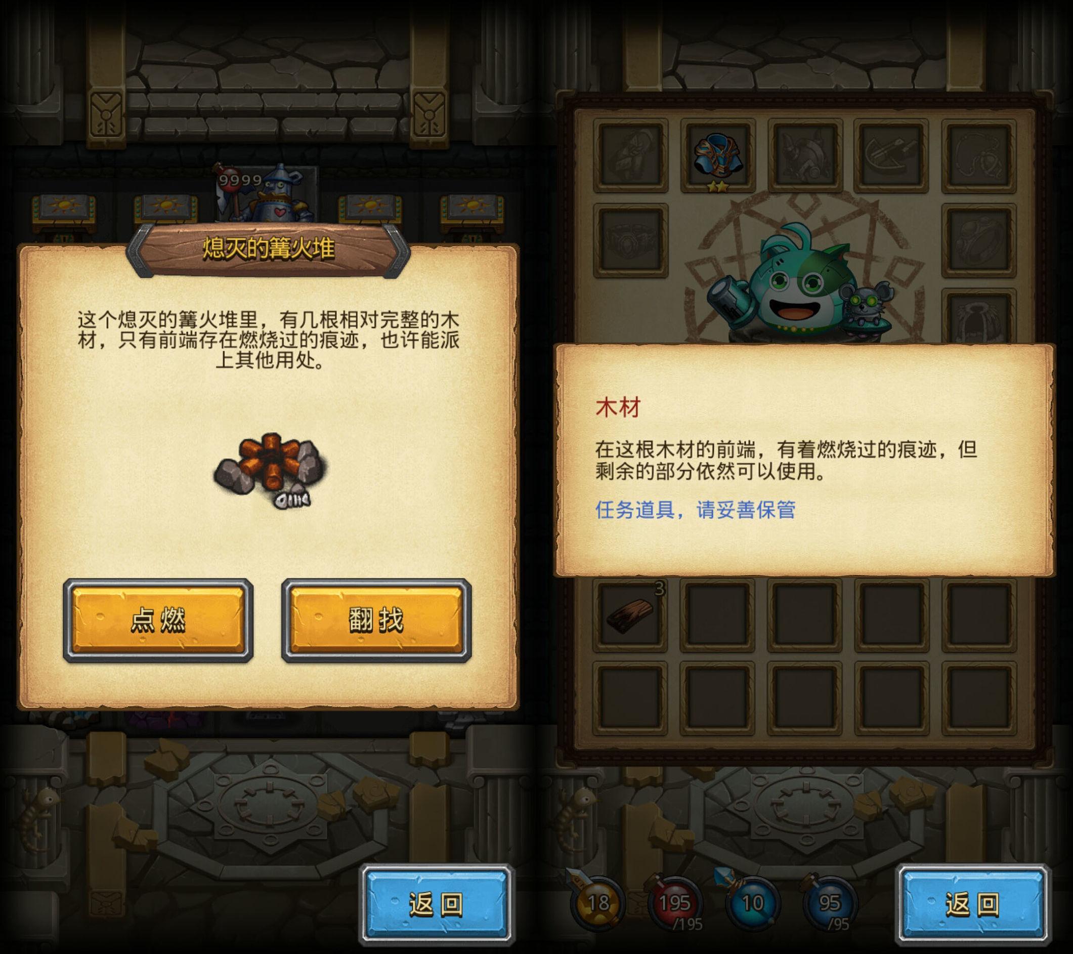 4.点击熄灭的篝火堆(先翻找获得三块【木材】,然后点燃,在翻找获得【火把】)