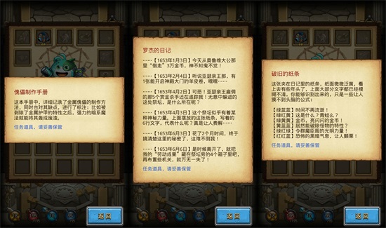 1.点击废弃的书架(获得【傀儡制作手册】、【罗杰的日记】、【破旧的纸条】)