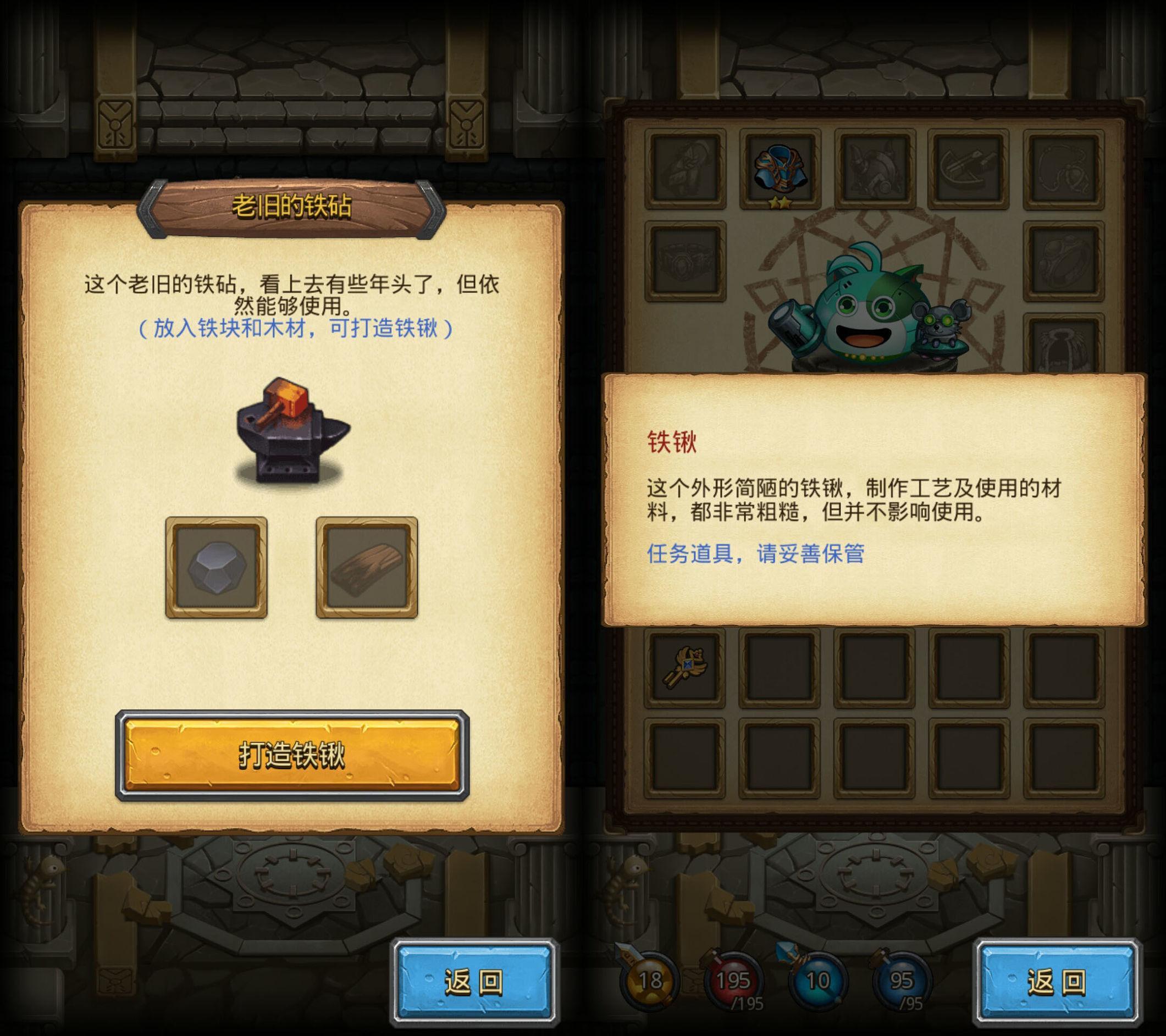 6.点击老旧的铁砧把【生锈的铁块】和【木材】打造铁锹(一共打造三把)