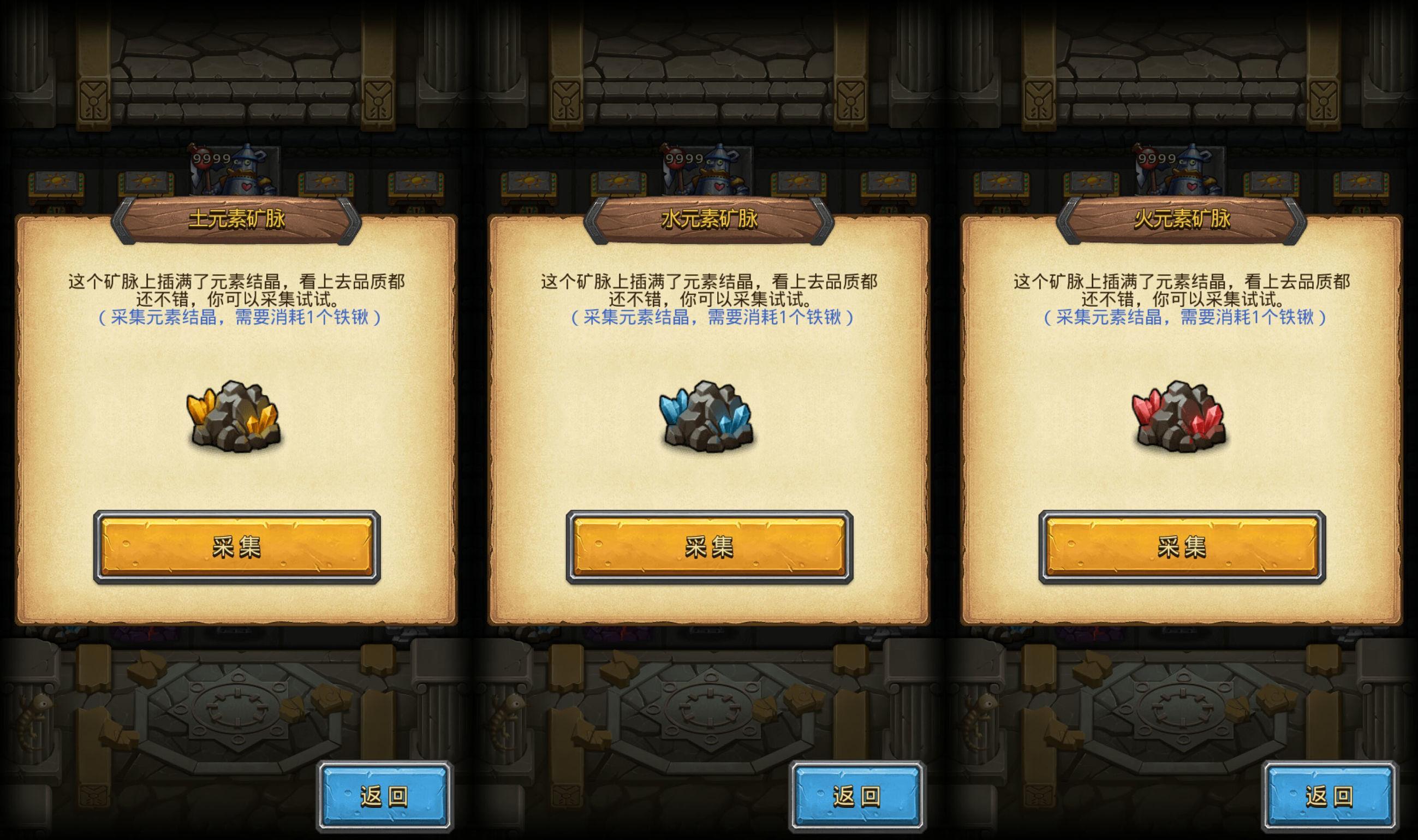 7.点击土元素矿脉(黄)、火元素矿脉(红)、水元素矿脉(蓝)(分别获得3颗【土元素结晶】、【火元素结晶】、【水元素结晶】)