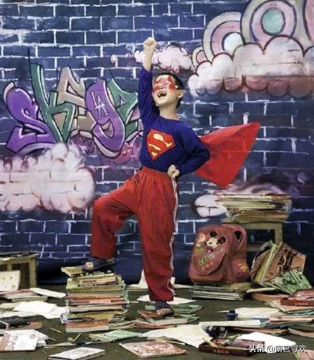 以为自己是超人,这样上学的路上,就能保护好自己的作业本了吧!