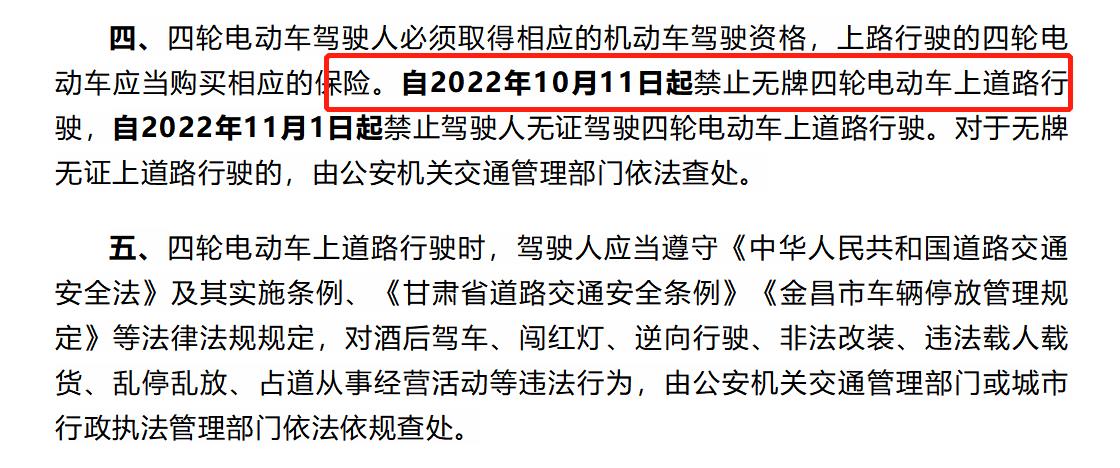 甘肃金昌:10月11日起禁止无牌电动四轮车上路