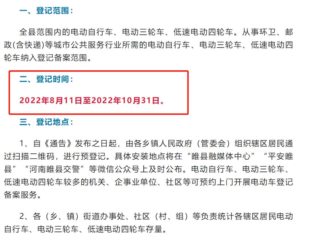 河南睢县:10月31日前可为非标三、四轮车备案登记