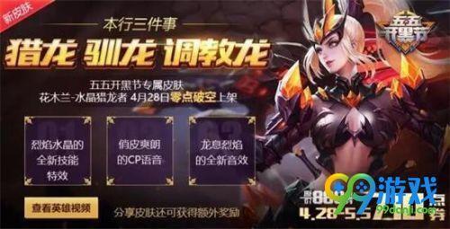 这款皮肤的上线时间已经确定,就是五五开黑节那天,和2017年花木兰水晶猎龙者是一样的!