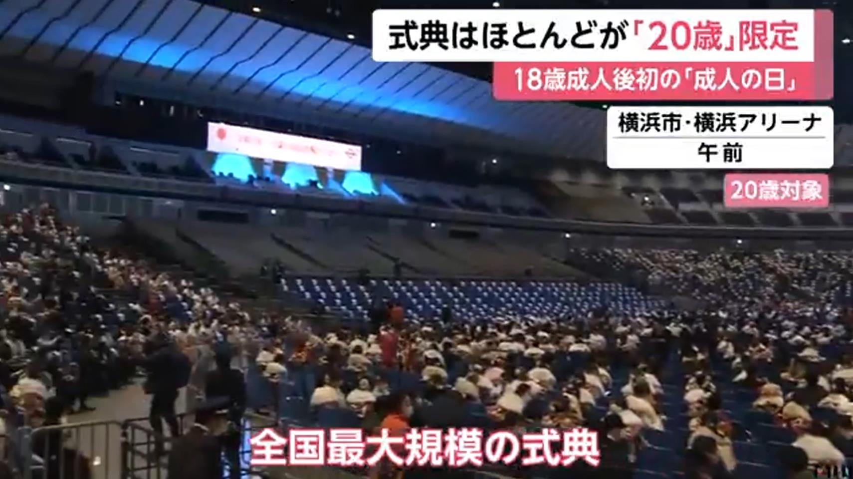 在神奈川县的横滨,今天举行了全国最大的仪式,名称从 "成年仪式 "改为 "庆祝20岁公民聚会"。