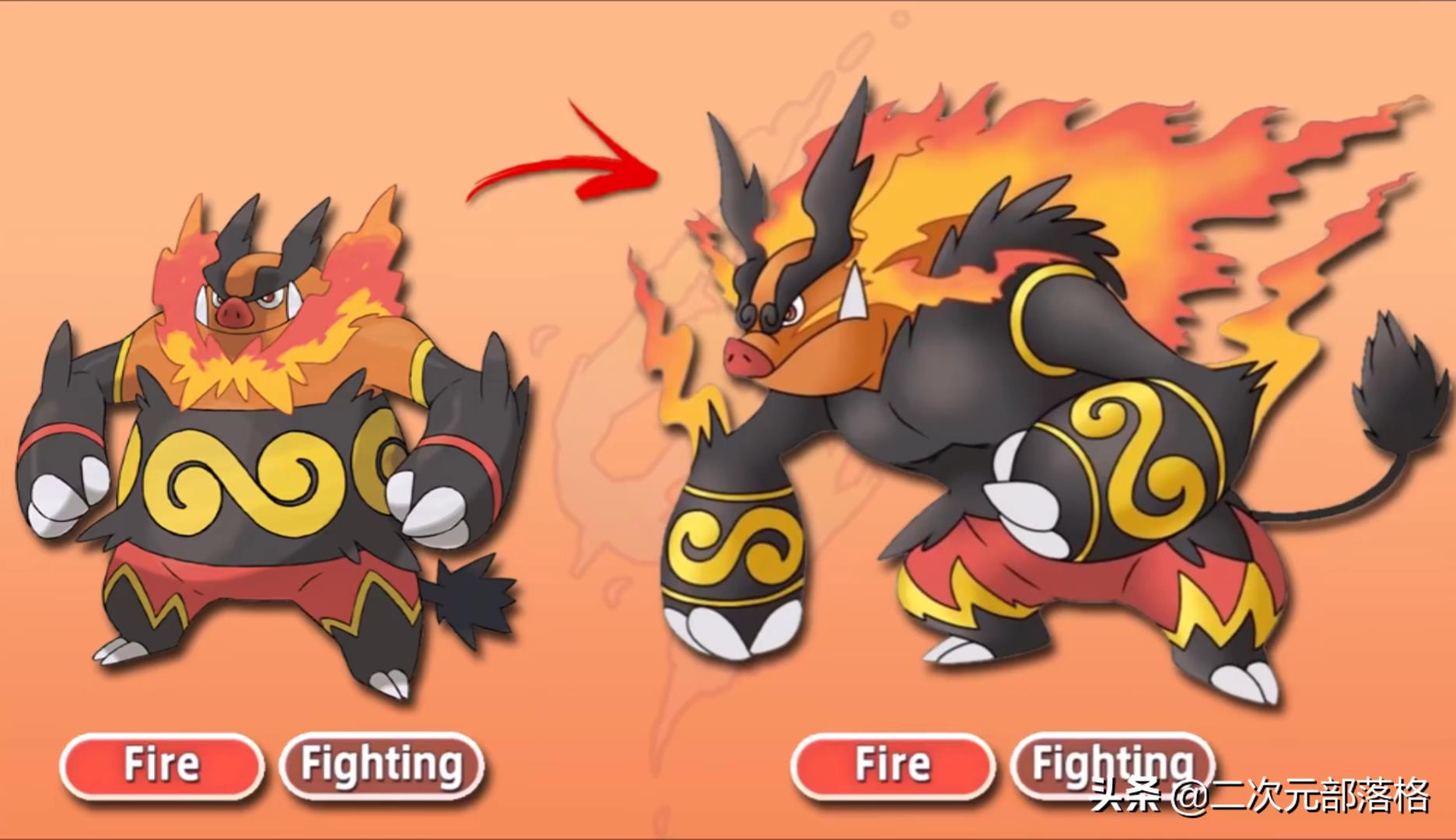 属性上炎武王依旧是火+格斗双属性,其实不改变也是很正常的,毕竟炎武王的弊端不是在属性上,而是在种族值分布不均,不过毕竟看上去很像猪八戒,所以速度慢也算还原,这也造成炎武王的尴尬。