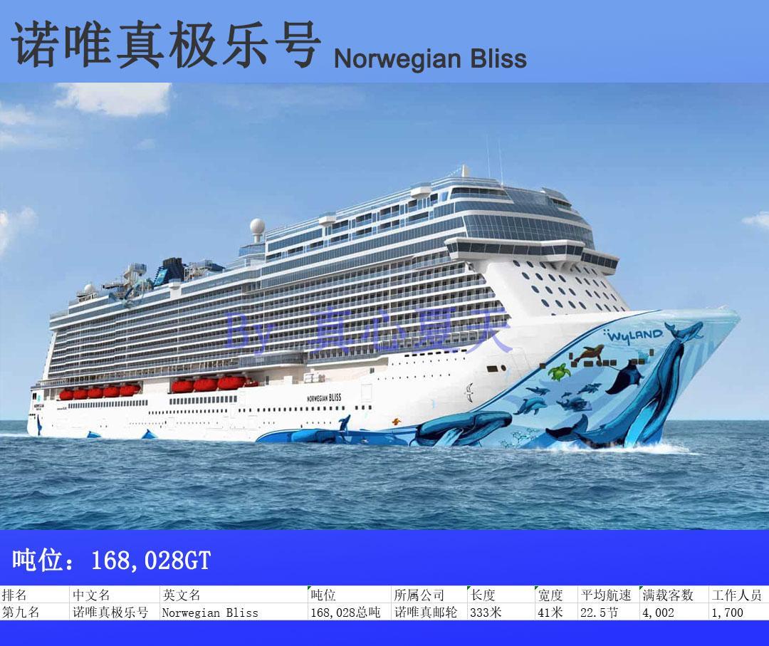 2016 年 10 月开工建造的诺唯真游轮 Breakaway Plus 级别的最新成员诺唯真极乐号(Norwegian Bliss),是诺唯真品牌旗下第三艘 Breakaway Plus 级别的游轮,也是诺唯真游轮在迈尔造船厂建造的第 12 艘船舶,当时曾以传统钢板切割仪式庆祝。诺唯真极乐号长 1,082 尺,宽 136 尺,总吨位 167,800 吨,可载客 4,000 人。