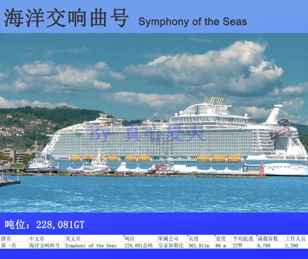 “海洋交响号”长361米,高72.5米,有18层甲板,速度只有22节(41公里/小时)。2018年4月7日,经过长达三年的建设,这艘世界上最大的邮轮终于从西班牙的巴塞罗那启航,开始在地中海开始巡航。