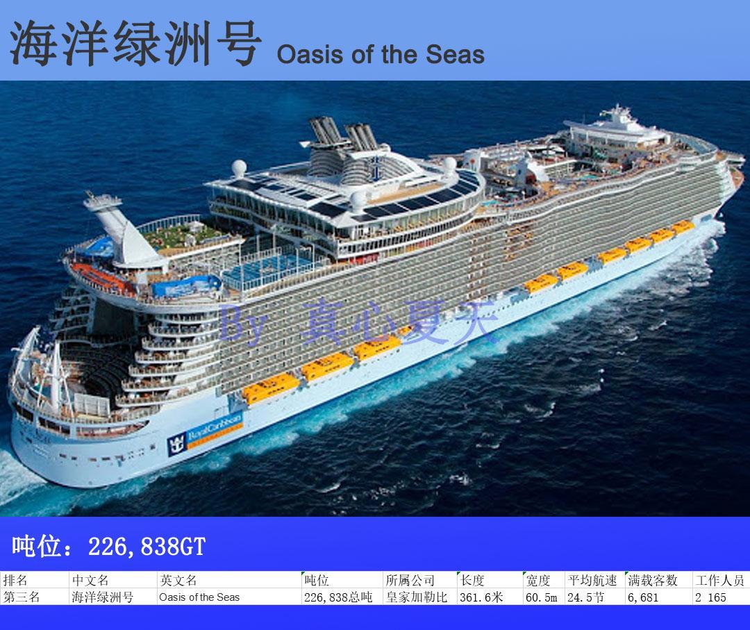 海洋绿洲号是一艘巨大邮轮,长360米,宽47米,高出水面65米。2009年10月28日完成交接,已于2009年12月1日开始处女航。这艘巨轮设计别出心裁,带有剧院、赌场、商店、游泳池、露天公园以及攀岩场地。“海洋绿洲”号邮轮大小为“泰坦尼克”号的5倍,连美国军方“尼米兹”级航空母舰都相形见绌。