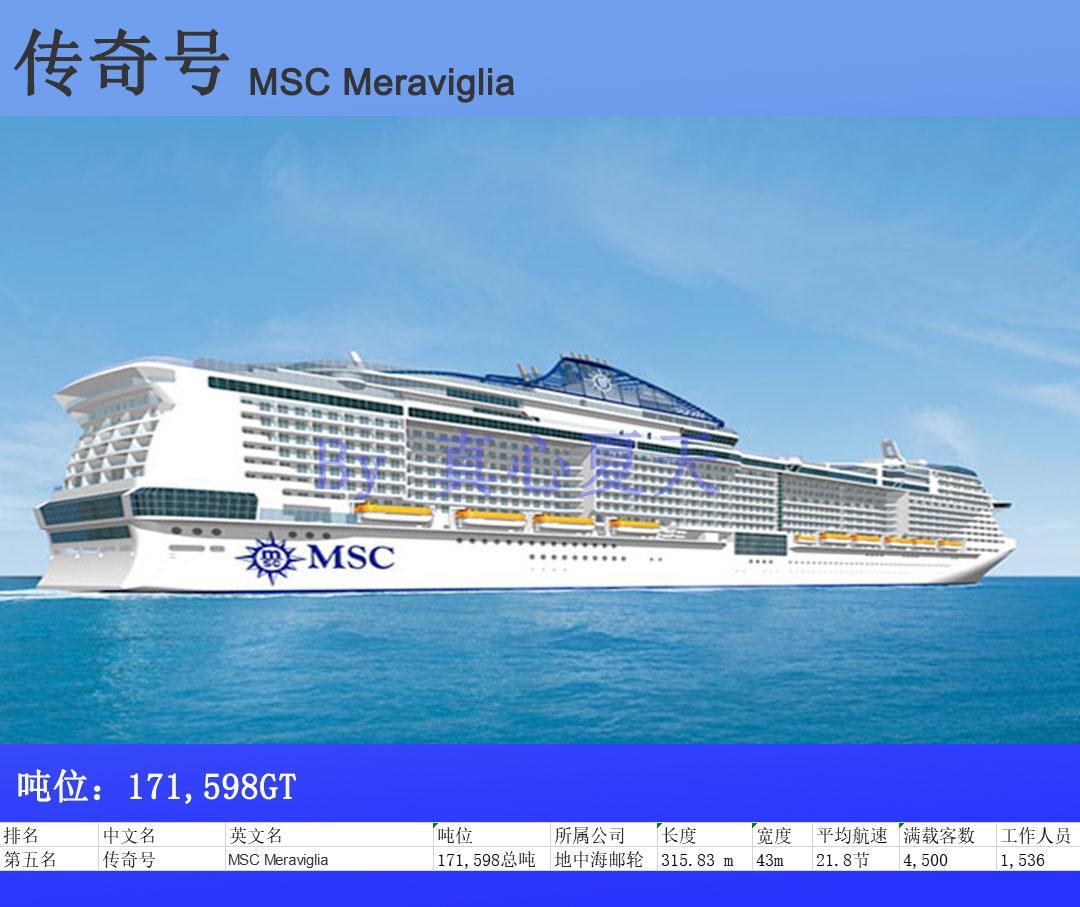 地中海邮轮传奇号是截止目前唯一一艘排名前五的非皇家加勒比的豪华游轮,总登记吨位达171,598吨,最大载客量为5,714人,1536工作人员为乘客服务,首航日期2017年6月,最高航速22.7节。