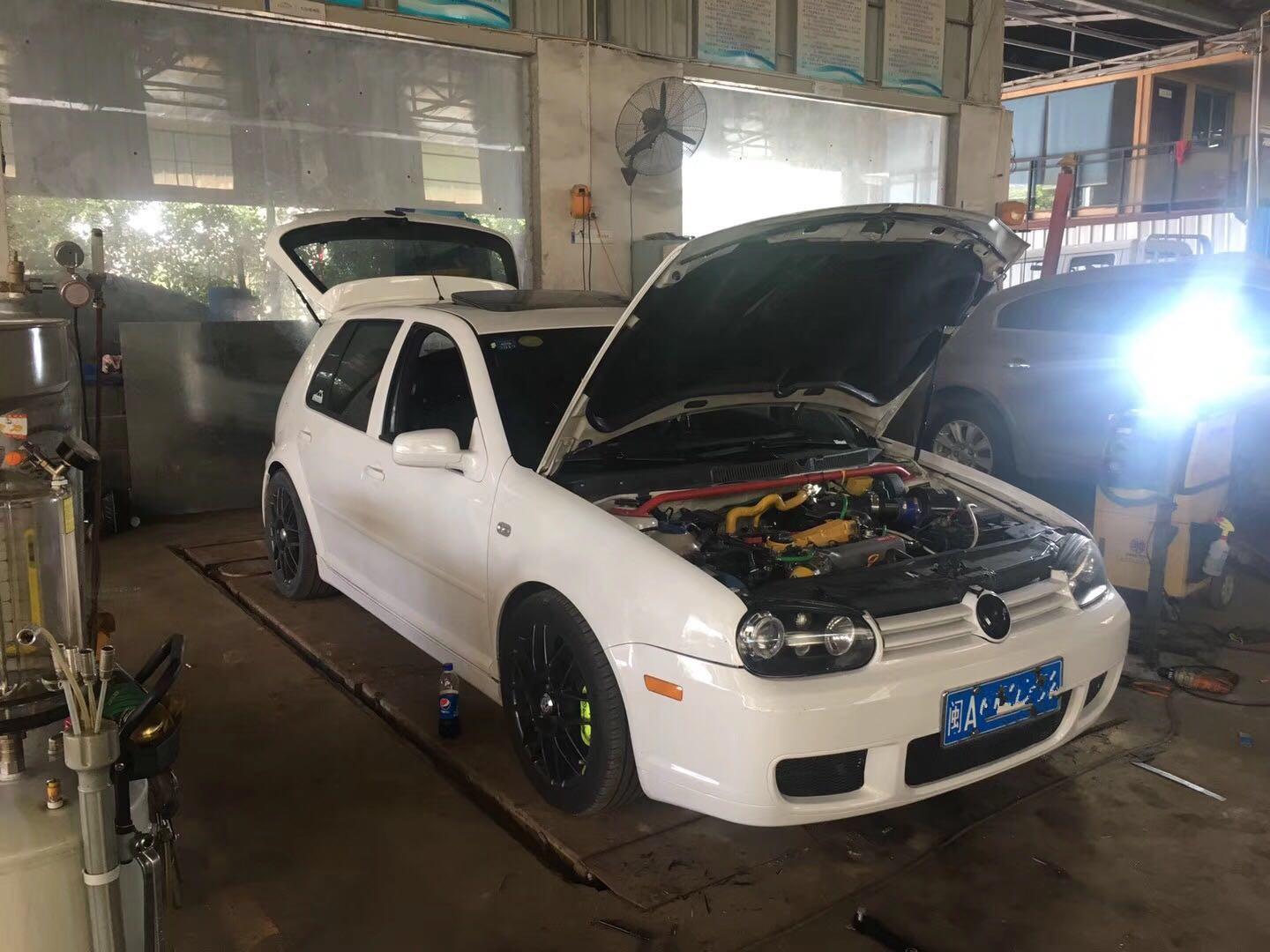 再想升级马力的话普通版本TT1.8T原厂180匹马力只需更改04涡轮,配合317或386喷油嘴,换上4.0燃油压力调节器,换上高流量进气,刷好程序轻松达到265匹马力, 配合半热熔胎一般可以跑进5.3秒左右破百,差不多一台前驱车的极限了,当然马力的提升,刹车那些就也要跟着升级,老周以前以前走的弯路就在于没有计划,看到改件可以装就往车上装,结果别人是弯路,我走了水路,这点还是多告诫小白玩家,一定要自己功课做好,改件不是越多越好,要有计划的下来,多问车友质询意见,然后自己归纳自己要走的路线,也有疯狂的大神改好4驱版本的高尔夫4代,移植了3.2L的6缸发动机,声浪比1.8T的迷人很多,但是不刷程序的时候还是跑不过刷好程序的1.8T。