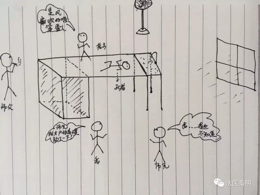 第三秒,当风扇第二次转到尸体这边的时候,我们才反应过来,原来是风扇吹的!风扇摆头刚好摆到这边,袖口动的这一刻,刚好被我们三个同时看到了~就是这么巧!我想那一刻大概我们三个的心脏都漏跳了一拍吧,真应了那句话:“非风动,非幡动,仁者心动”啊(工作并不总是那么严肃,有时候还是挺欢乐的)。