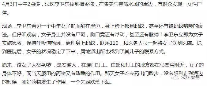 我还曾碰到过高坠尸体上发现电流斑的、高坠尸体上发现颈部缢沟的、电流斑不明显但是看监控视频明显是触电死的等等情况,更有甚者,检验“尸体”时发现“尸体”竟然还是活的,比如下面这起新闻案例,尸体就“死而复生”: