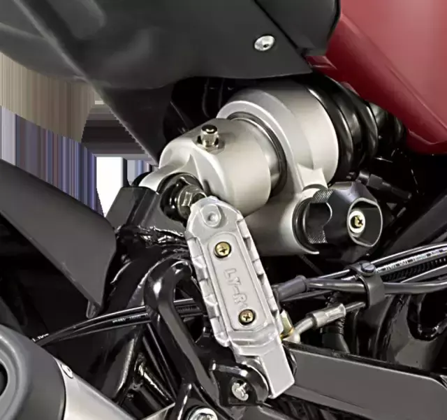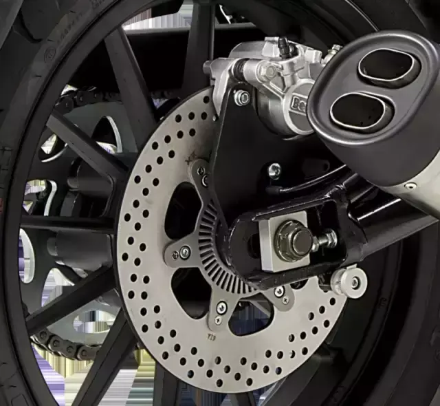 前减震采用45mm直径的倒置减震,行程125mm,后摇臂水平加载弹簧减震,预载可调。