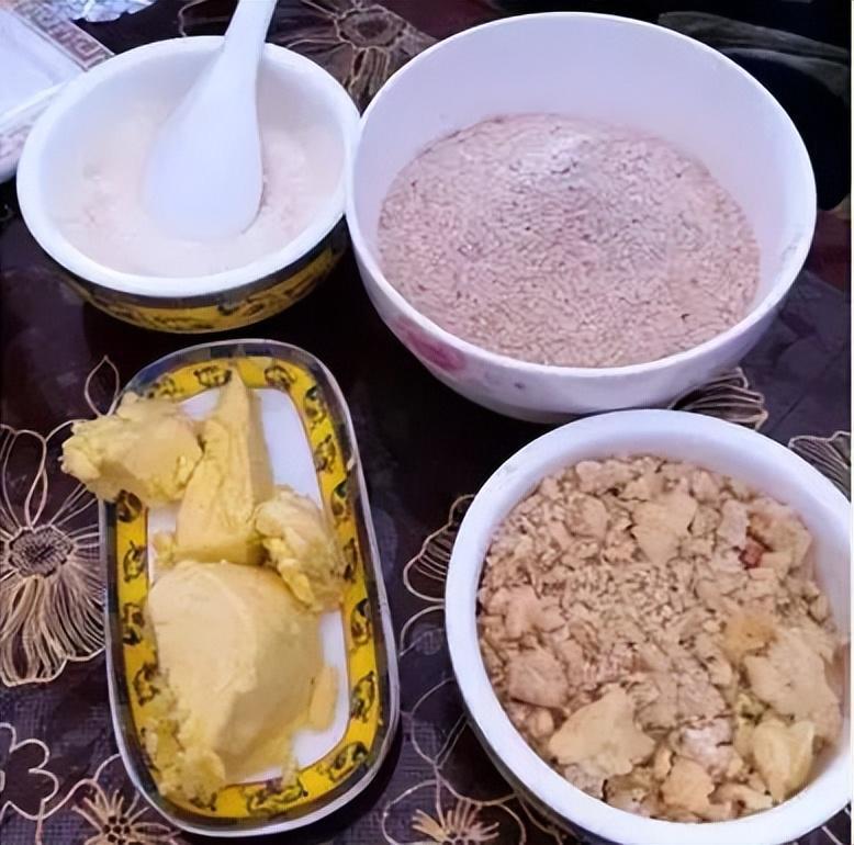 糌粑:糌粑是藏族的主食。糌粑,实际上糌粑就是用青稞制成的炒面。它是将青稞麦炒熟、磨细、不经过筛滤而成的炒面,与我国北方制作的炒面有点相似,区别是北方的炒面是先磨后炒,而西藏的糌粑却是先炒后磨,而且不除皮。