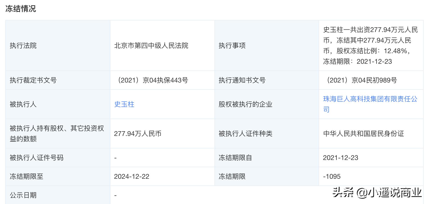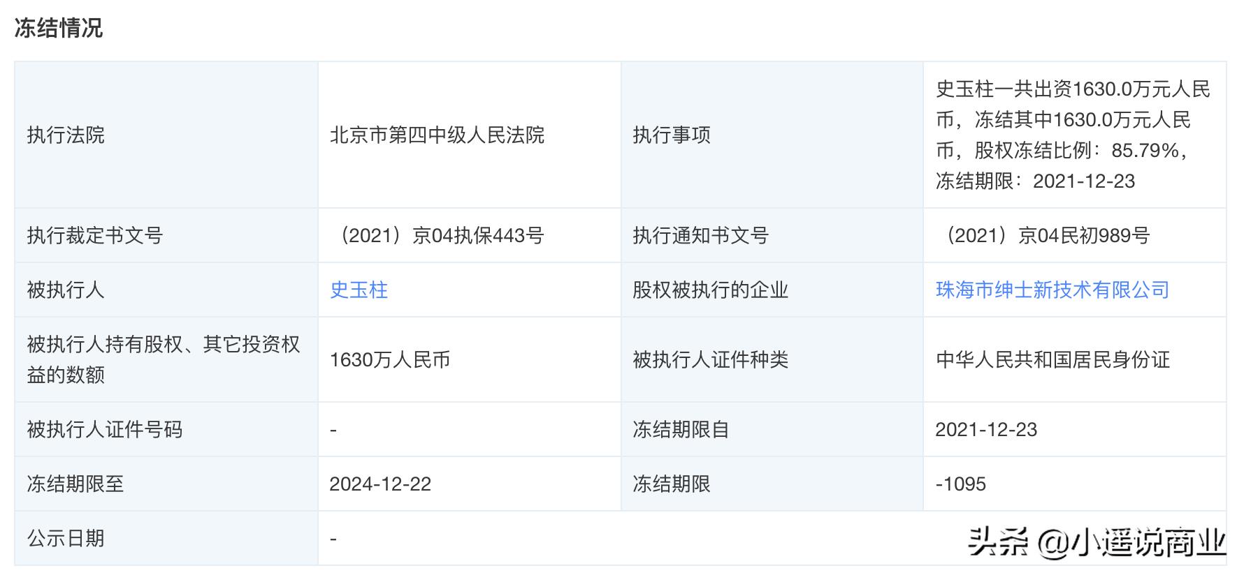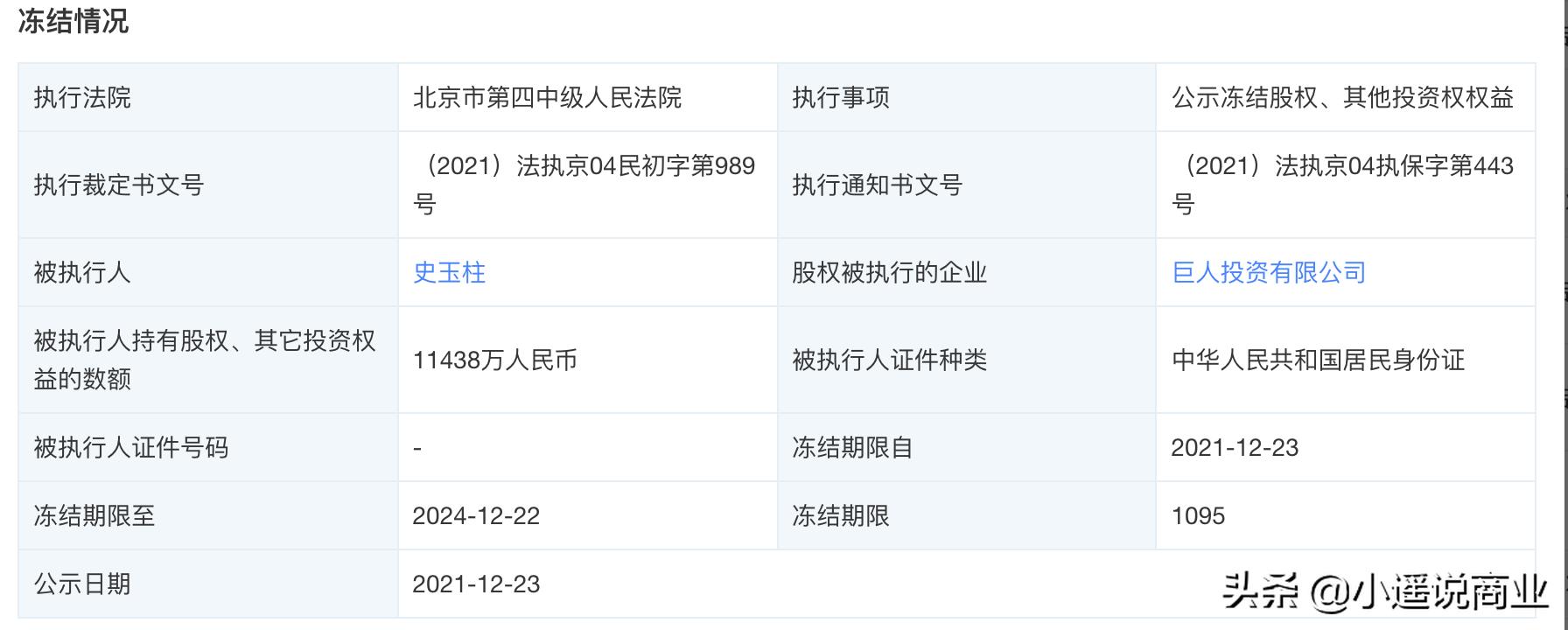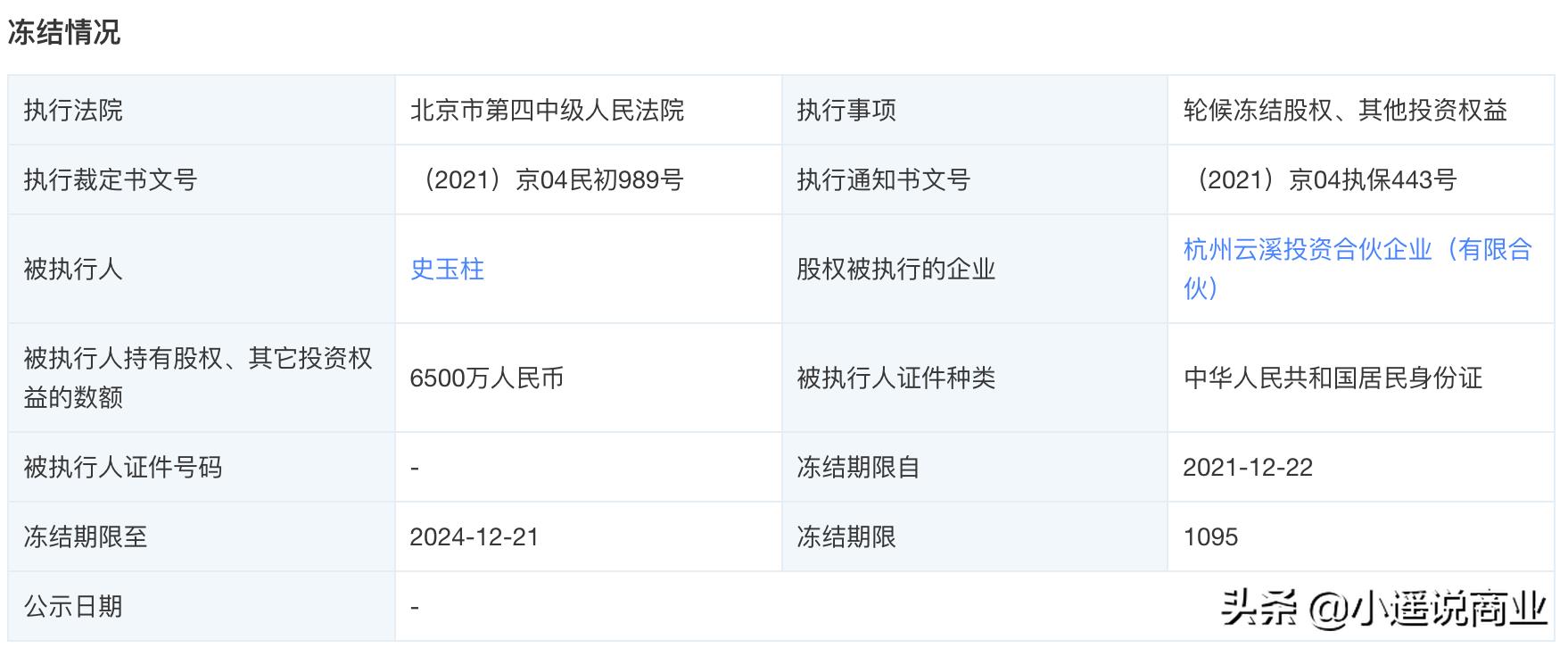 天眼查显示,近期史玉柱先后被冻结股权1.14亿人民币、6500万人民币,累计下来,史玉柱已经被冻结股权将近2亿。