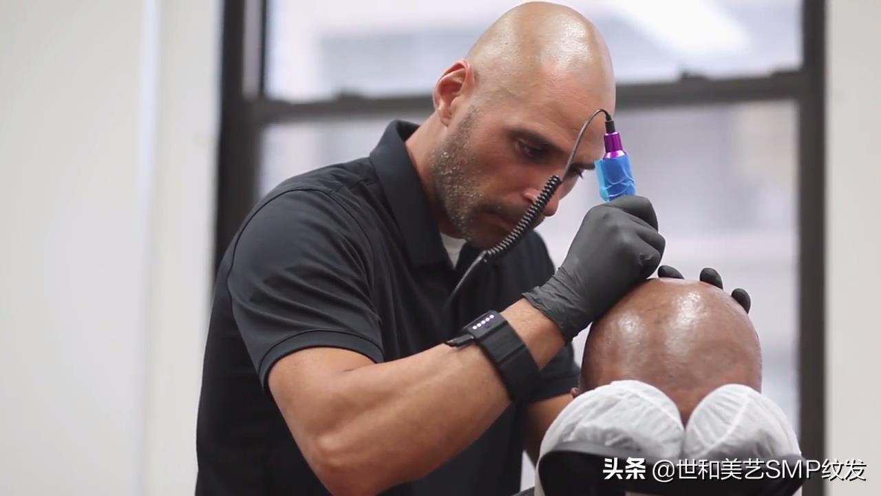纹发的概念起源于欧美,英语中叫scalp micropigmentation,简称SMP,逐字翻译的话就是头皮微色素着色。欧美有的还叫Hair tattoo,即头皮纹身的意思,但其实纹发已经脱离了纹身的概念。简单地说,纹发就是利用笔状的纹发机器,按照人头部真实毛囊的分布密度在头顶不断地点,纹针将专用色素带入到头部的表皮层与真皮层中间,从而做出仿真毛囊的效果。