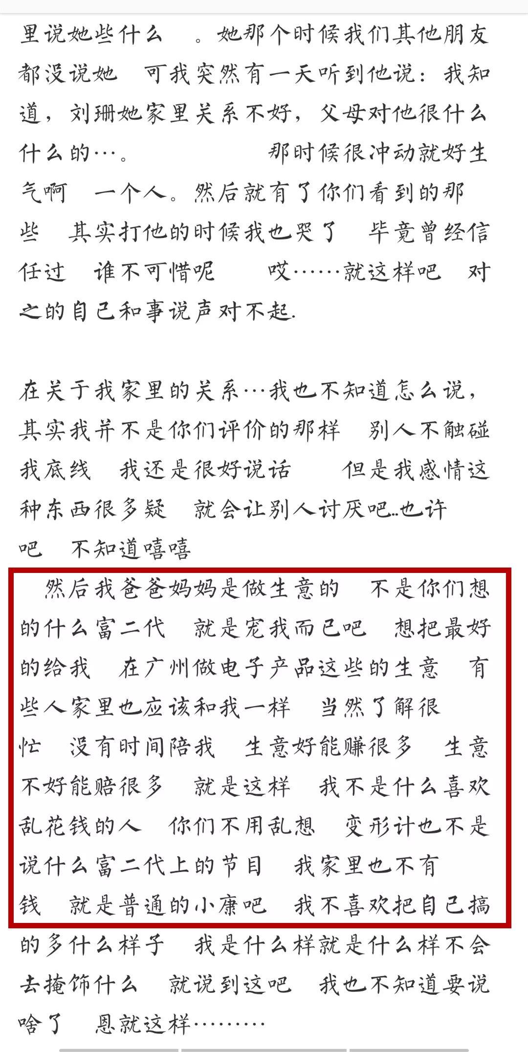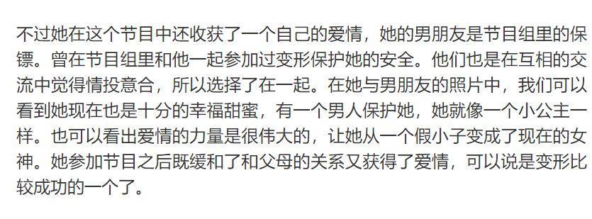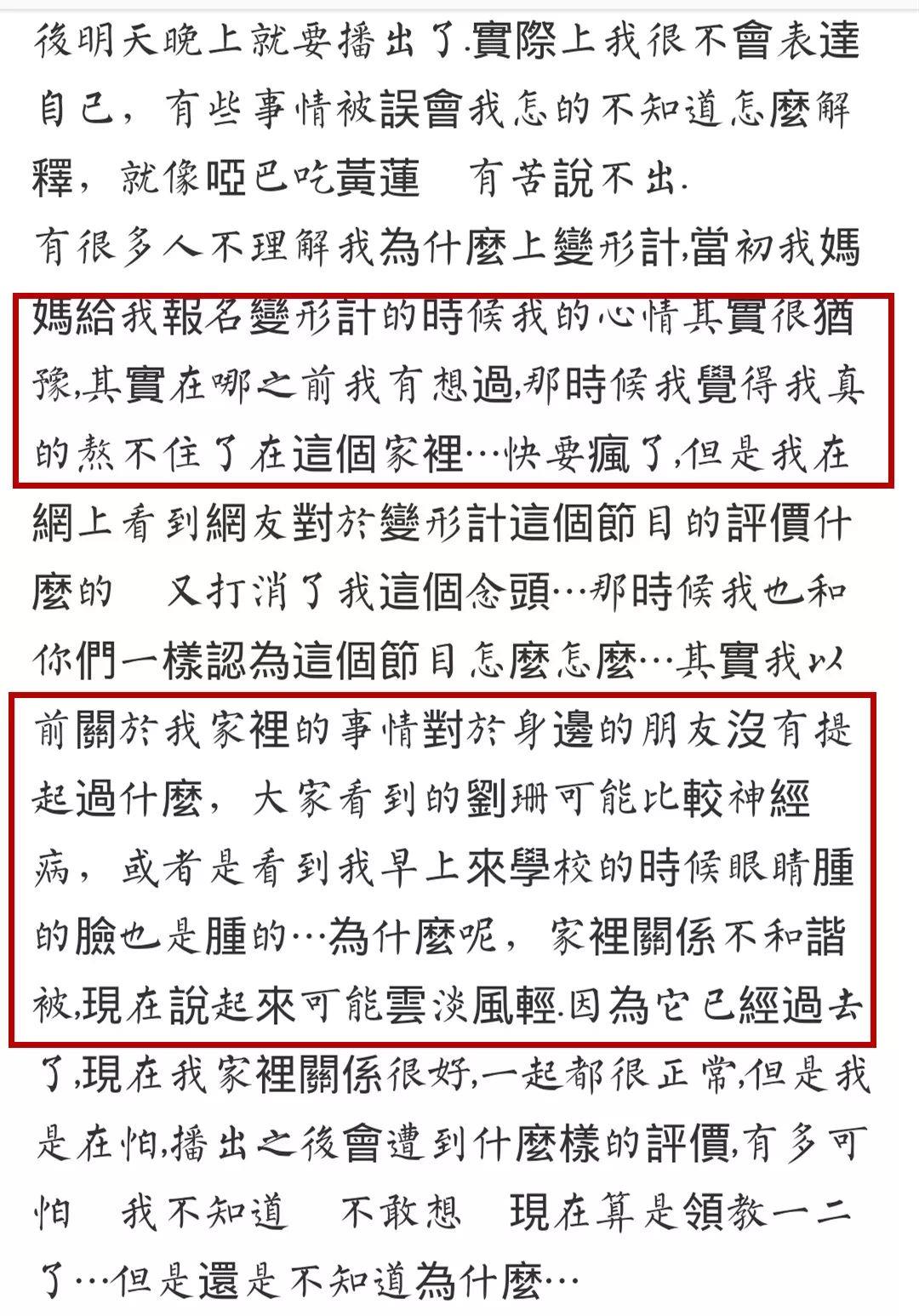 而且相比于其他的变形的孩子,刘珊看起来并没有那么叛逆。节目开播前,她曾在微博发长文来讲述自己的故事。大概意思就是说自己因为不想在家待着,所以来参加了《变形计》。