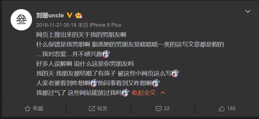 去年在网上有很多关于她男友的传闻,刘珊还发了个微博澄清。