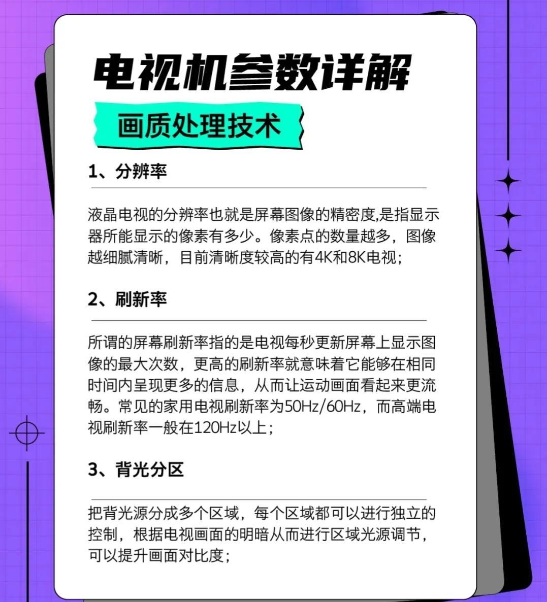 然后就是参数了,首先考虑就是画质技术方面。主要从分辨率,刷新率,背光分区