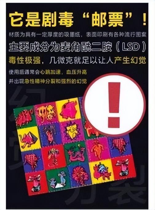 “邮票”,主要成分为麦角二乙胺(LSD),为一种强烈的半人工致幻剂。麦角二乙胺吸附于印有特殊图案的吸水纸上,故俗称“邮票”,由境外流入,仅手指甲盖三分之一大小,含在嘴里就能“吸食”,致幻性是大麻等传统毒品的数倍,价格相对较低,瞄准青少年,透过皮肤就能渗入人体。具有毒性极强、隐蔽难发现等特点。