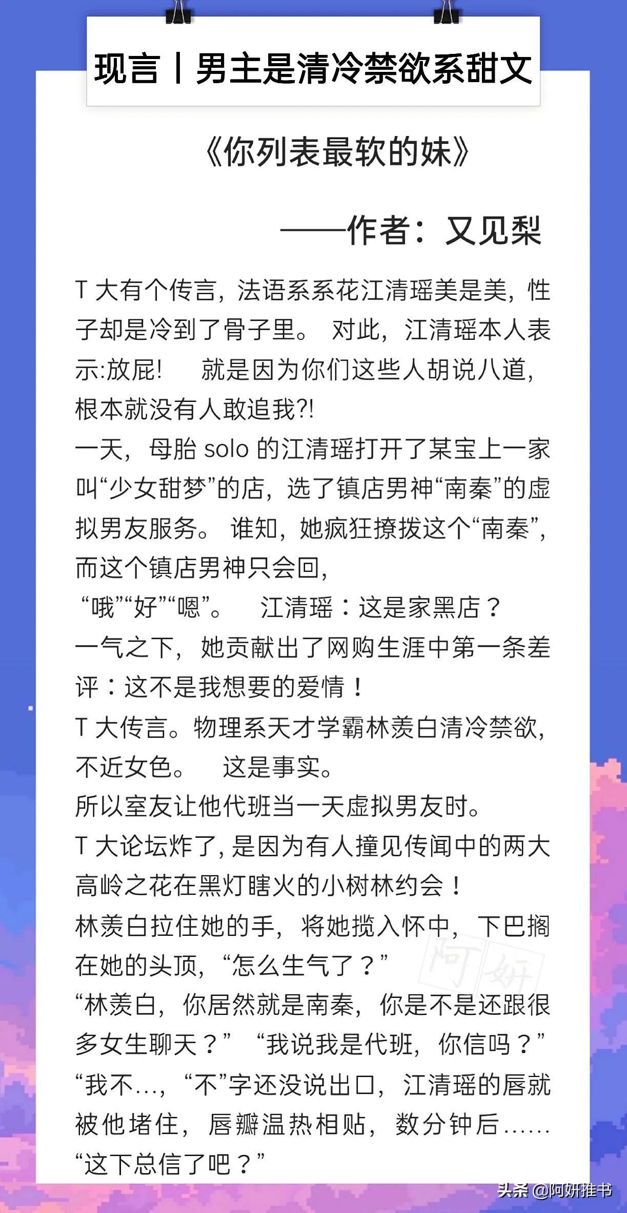 今天给大家推荐的是:3本男主是清冷禁欲系甜文!男主禁欲系前期傲娇冷淡,但是一开窍后就变成情话小王子,对女主们非常非常宠,细心又温柔,给足了女主偏爱与宠爱,超级会撩又欲又勾人,男主们这设定太太太犯规了。女主们就是个活脱脱的小妖精,把高岭之花拉下的神坛。男女主暧昧之间写的超级有氛围感!!超级欲!!超甜,真的甜到昏的那种,超级好看,放心冲!