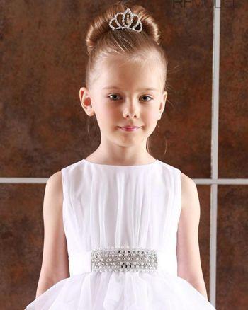 这么小就这么高贵有范儿的女童,金色柔顺的长发盘成精致高洁的大丸子头,在脑后盘桓散开,发髻正前方插上一个精美的公主皇冠,穿上白色的公主裙,最美最有气质的小公主就塑造出来了。