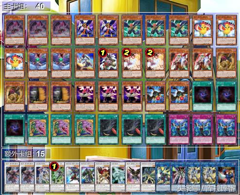 额外卡组:黑羽-重装铠翼鸦2,水晶翼同调龙1,PSY骨架王Ω1,强袭黑羽-骤雨之雷切刀鸟1,强袭黑羽-泪雨之千鸟刀鸟1,黑羽驯鸟师-漆黑之鹰匠·乔1,流星登龙1,黑羽-星影之苦剑鸟1,强袭黑羽-五月雨之骚速刀鸟1,刺刀枪管龙1,拓扑三叶双头蛇1,水晶机巧-继承玻纤1,见习魔娘1。