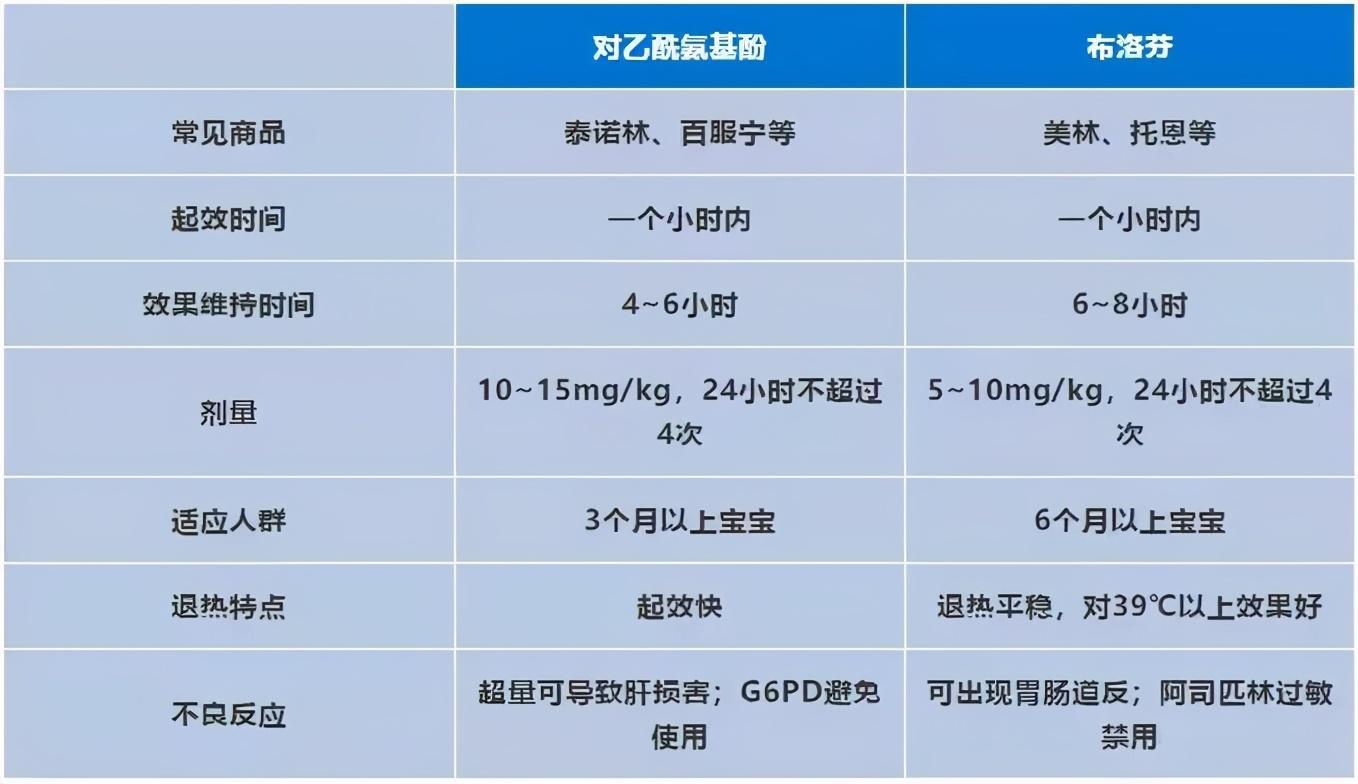 世界卫生组织推荐的退烧药是布洛芬(如:美林)或对乙酰氨基酚(如:泰诺林),但并不推荐两种药同时重复使用。两种安全退烧药物使用比较如下: