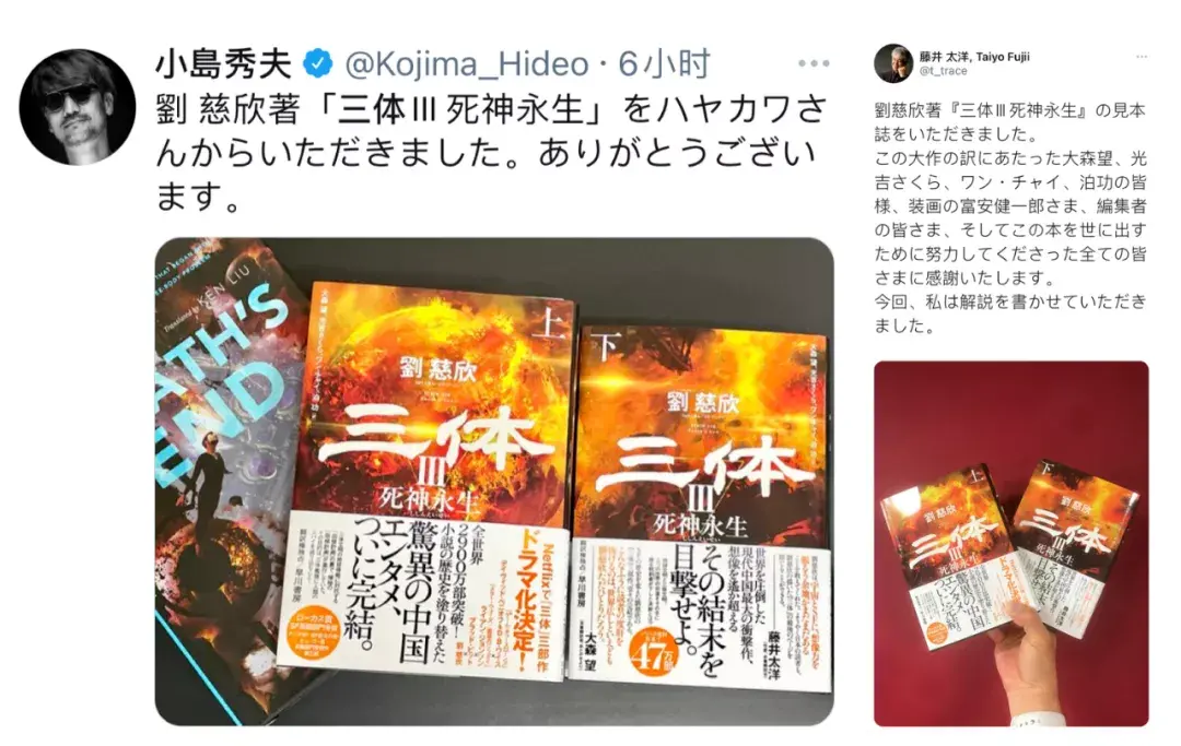 就连知名游戏制作人小岛秀夫,作家藤井太洋等超级《三体》迷都争分夺秒为最终章发推,加以宣传: