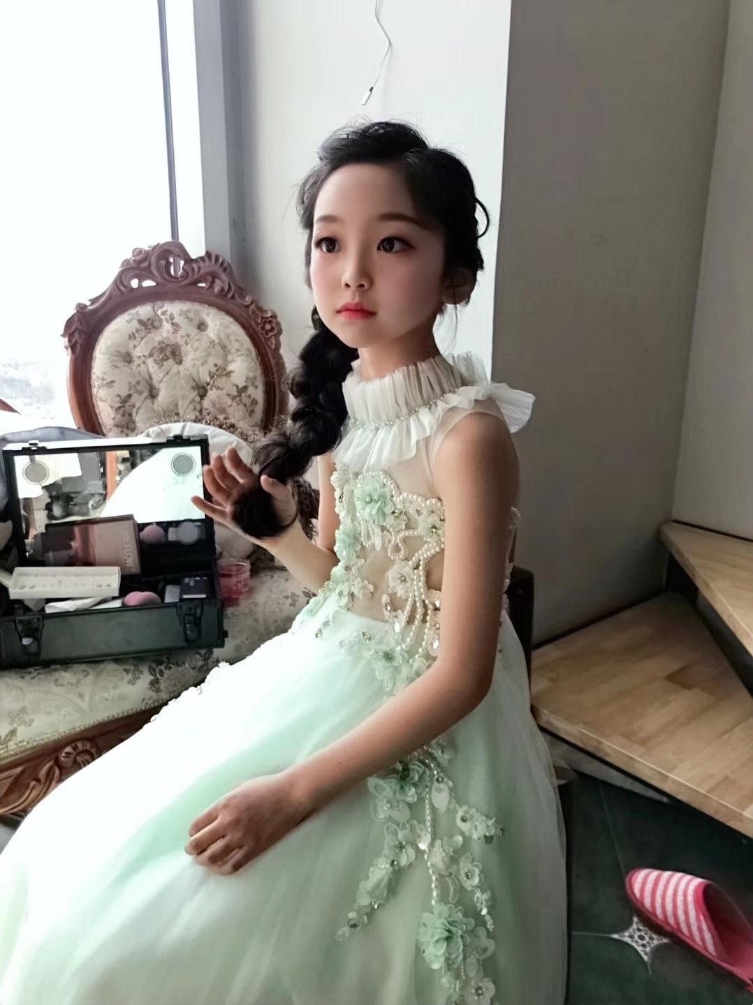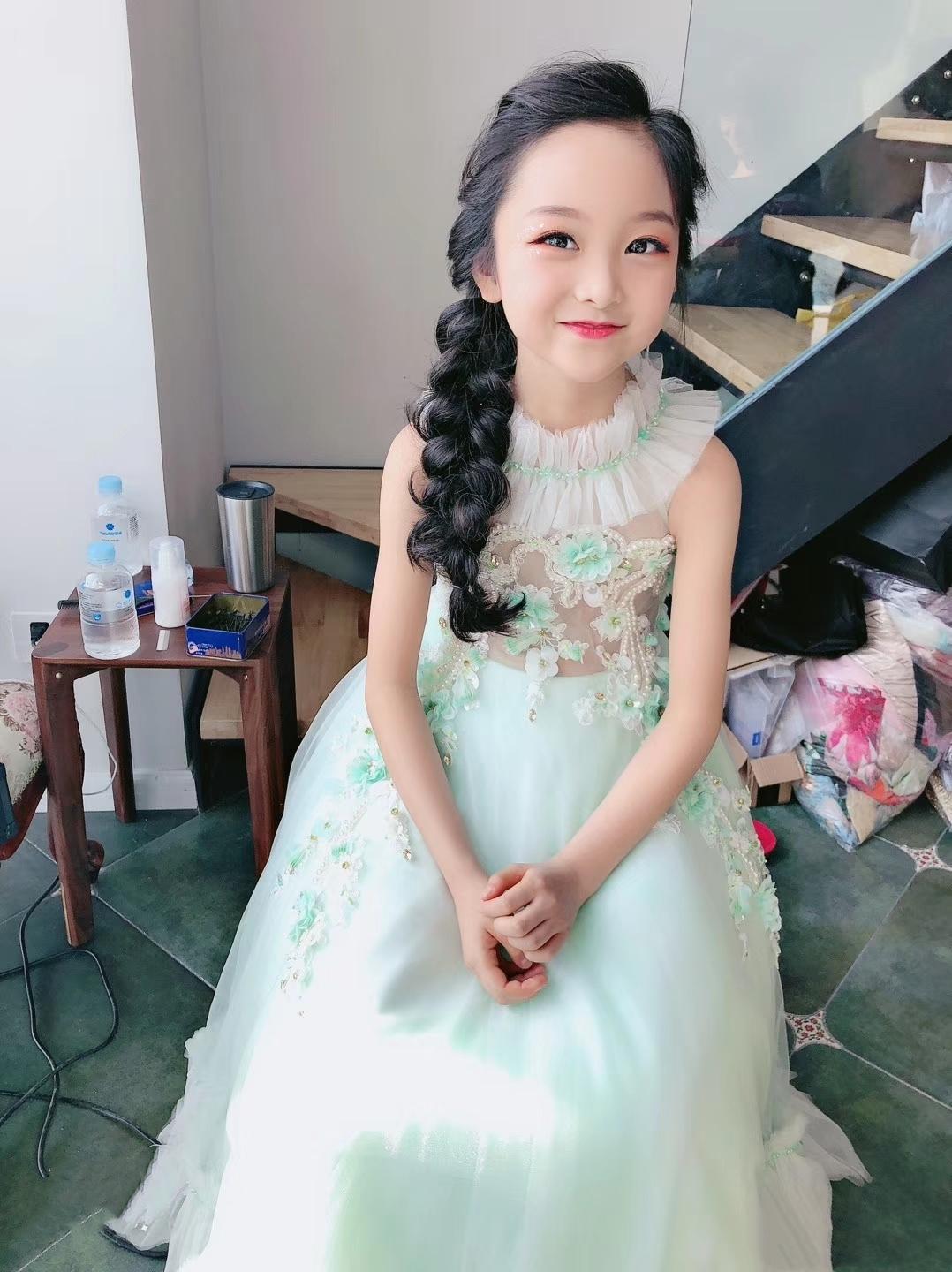 另外一套是清新的浅绿色纱裙,清新的公主纱裙加入立体花朵配饰点缀,很显精致。虽然服装造型很清新,但是依旧化了大浓妆,也是颇有小模特的风范呢。这次扎了个偏分的大麻花辫,放在一侧看起来很温柔优雅,不知道你有没有注意到这个发量,是不是非常优秀了?