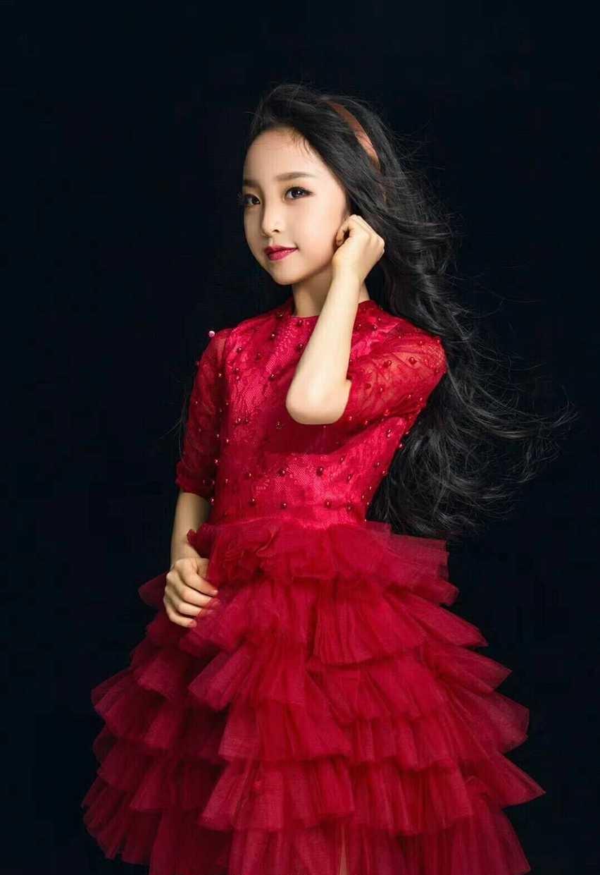 另外一套造型则是非常可爱的公主范,一袭大气的红色裙装,蛋糕层次的薄纱裙摆拼接质感的面料,上半身加入红色珍珠的点缀更显精致质感。长发披肩特别女神范,发尾加入波浪大卷,还佩戴了一个简单的红色发箍,简直就像童话里走出来的小公主。