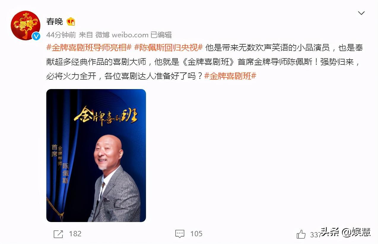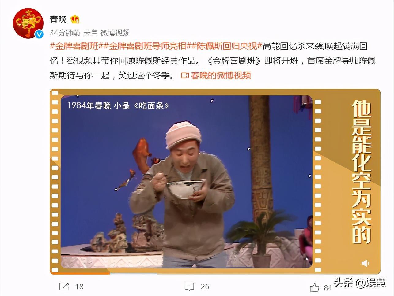 10月26日,认证信息为“中央电视台春节联欢晚会”的春晚官微,宣布陈佩斯正式回归,双方之间多年恩怨终于化解,文案中还特意带上了#陈佩斯回归央视舞台#的话题。