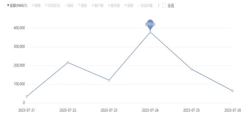 截至7月26日,相关舆情信息总量共计999212条,包括微博610022条,客户端198343条,视频180499条,互动论坛7631条,网站2139条,微信566条,数字报12条。从媒体渠道来看,微博和客户端是舆情信息传播的主要渠道,分别占比61.05%和19.85%。
