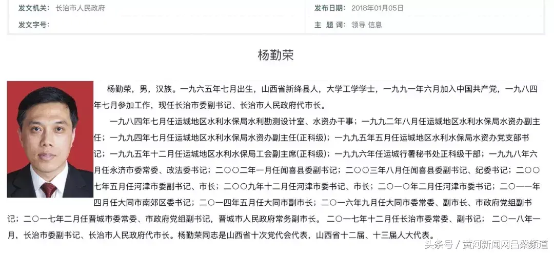 长治市委副书记杨勤荣,拟提名为市长候选人。1965年7月生,山西新绛人,大学学历,1991年6月加入中国共产党,1984年7月参加工作。曾任河津市长、市委书记,大同市南郊区委书记,大同市副市长,大同市委常委、副市长,晋城市委常委、副市长。