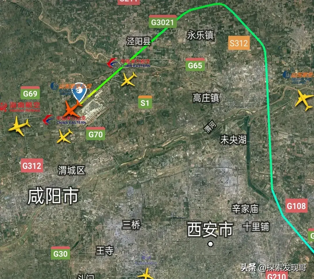 8点06分,到达咸阳市泾阳县三渠镇上空,高度1219米,速度337公里/小时。