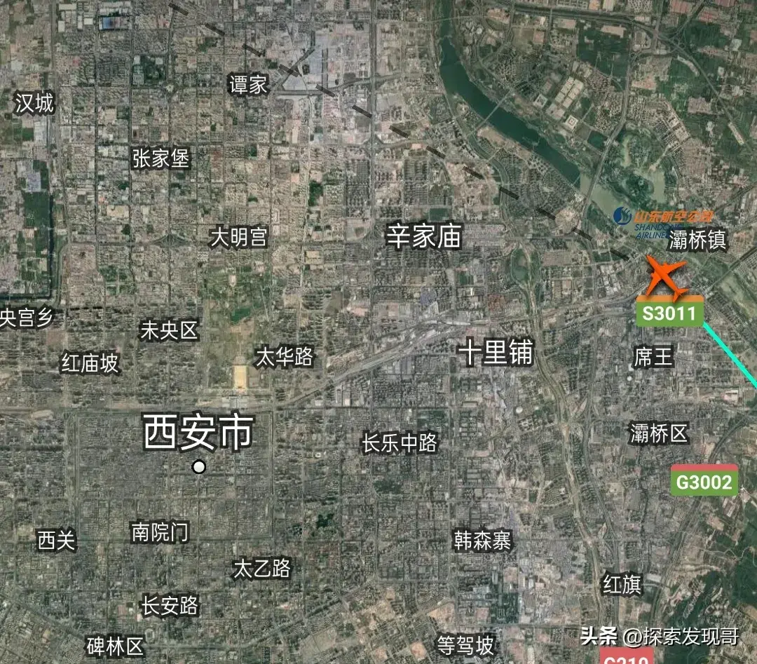 8点00分,到达西安市灞桥区席王街道上空,高度3044米,速度544公里/小时。