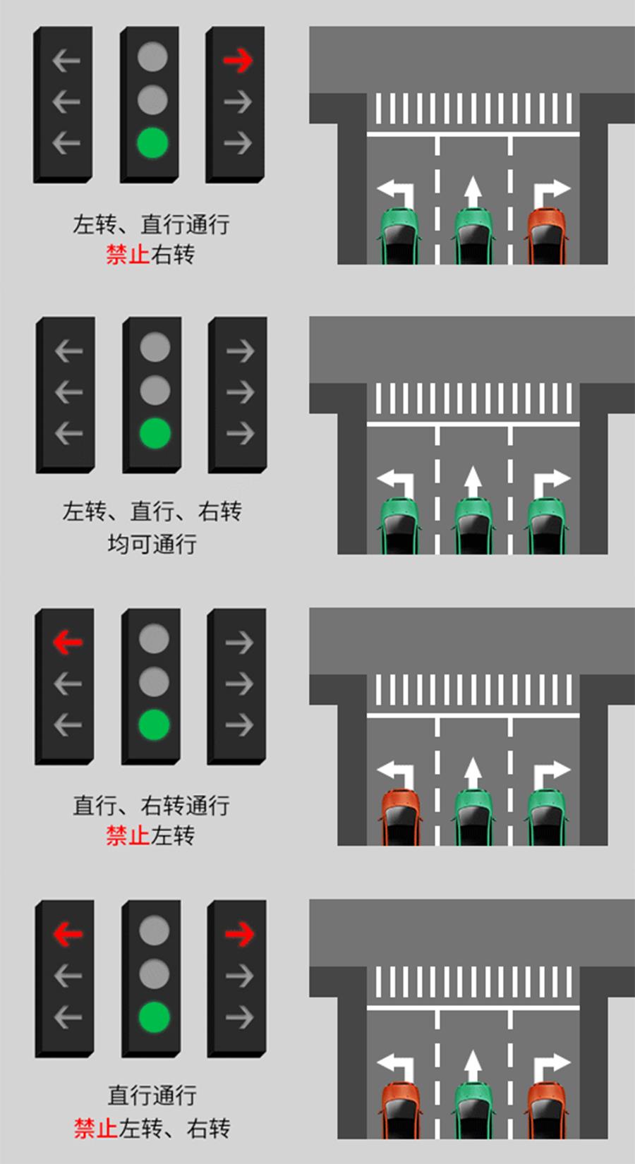 1、直行车辆:看中间的圆形灯,按照“红灯停绿灯行”的原则即可;