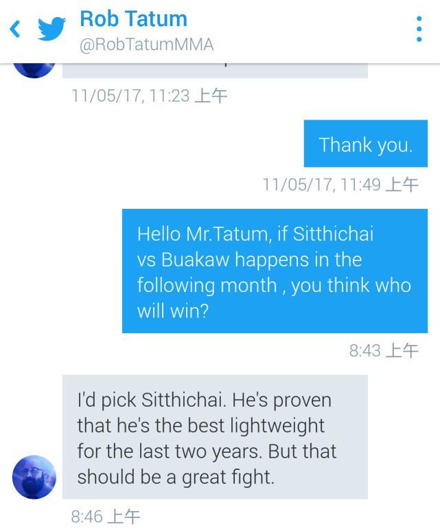 对于这场泰拳史上最伟大的战斗,同时身兼搏击排名委员会主编和CombatPress专栏作家的塔图姆给出了自己的看法,他对《拳击时空》表示,“我会选择西提猜赢得胜利。在过去两年里,西提猜证明了自己是轻量级(70公斤级)世界上最出色的选手。不过他与播求的碰撞应该会很好看。”
