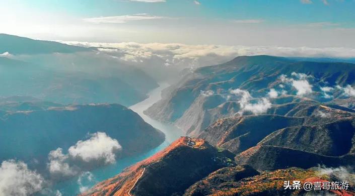 金沙江大峡谷,经巧家、昭阳、永善、绥江、水富北至四川省宜宾市,全长457公里,从海拔4040米巧家大药山下降至267米水富滚坎坝,山顶山峦起伏群峰雄峻,江面波涛汹涌暗流湍急,有国家特级险滩11个,江面最窄处溜铜江虎跳石仅20余米。
