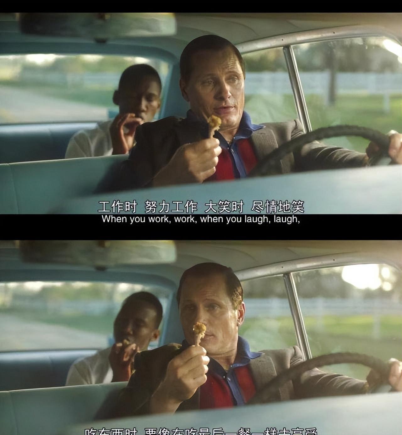 比如这段剧情:Tony怂恿从未吃过炸鸡的Don尝试,Don开始极力拒绝,最后架不住Tony的软磨硬泡终于吃上了人生第一口炸鸡,从此一发不可收拾。