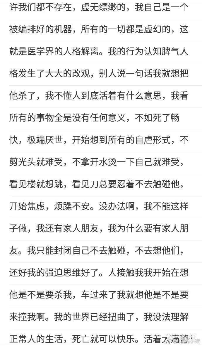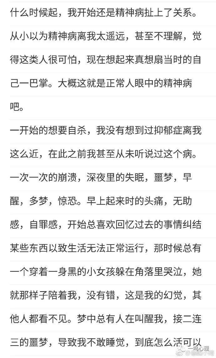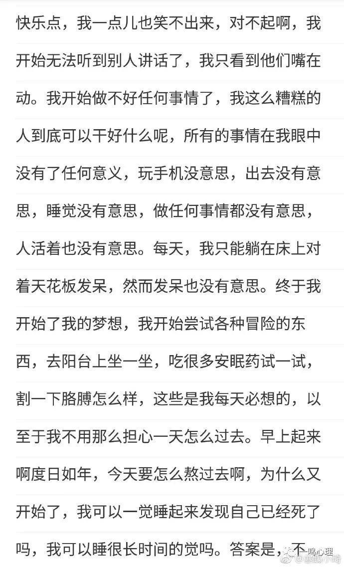 下面这段文字来自我的群组成员,相信大家看后,能更深入地了解抑郁症人群,知晓他们最真实的内在感受和状态。(一鸣心理 潘鸣)